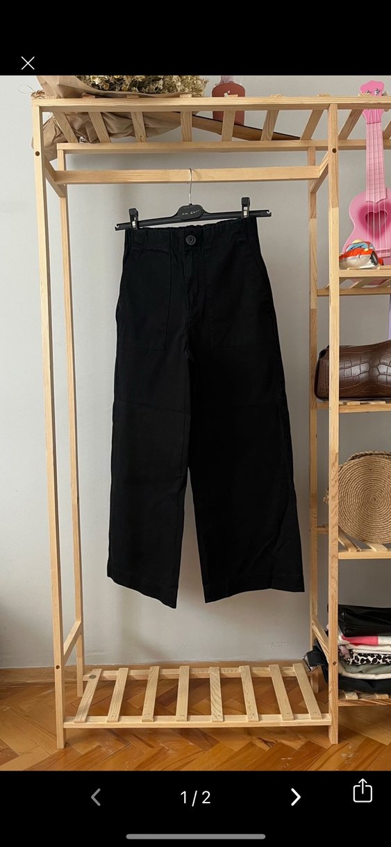 Siyah keten kumaştan, midi boy ve regular fit kesime sahip, günlük kullanım için minimalist tarzda kadın kumaş pantolon.
