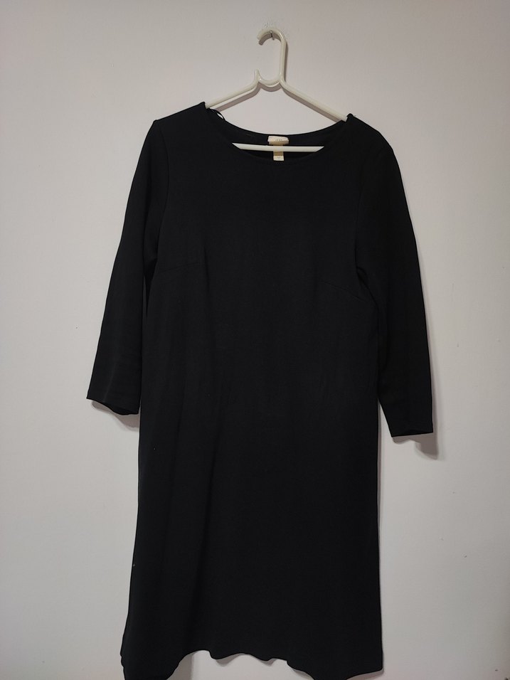 Siyah midi keten elbise, yuvarlak yaka ve uzun kollu. Rahat keten kumaştan, bol kesim ve minimal normcore tarzda, günlük kullanım için uygun.