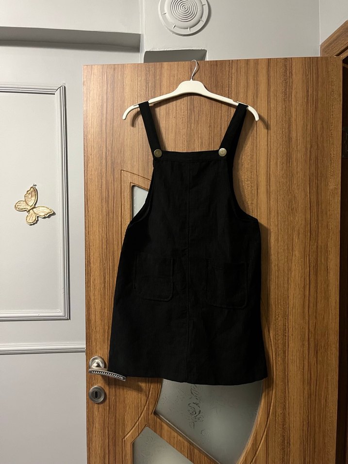 Siyah midi kısa tulum, askılı ve tokalı detaylıdır. Sentetik kumaştan üretilmiş, minimalist gotik tarzda günlük kullanıma uygundur. 36/38/40 beden uyumludur