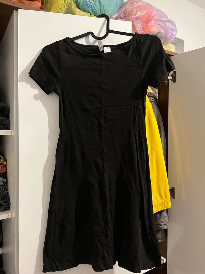 Siyah midi elbise, kısa kollu ve tekne yaka. Drapeli detaylarıyla minimal ve şık goth tarzını yansıtır.
