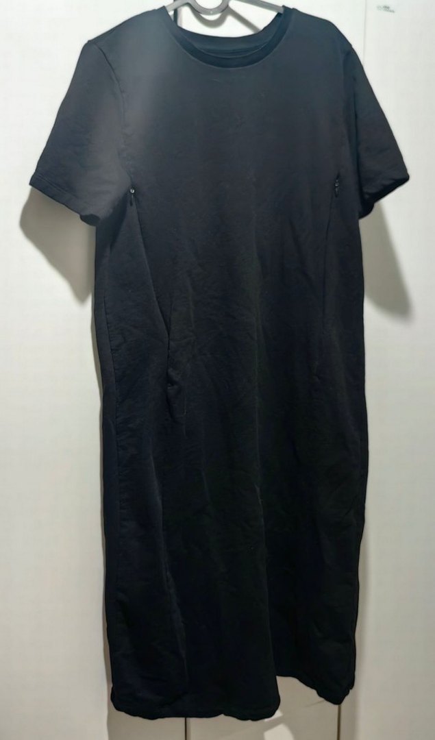 Düz siyah midi elbise, emzirme özellikli göğüs kısmı fermuarlı,kısa kollu ve yuvarlak yaka detaylı, günlük sokak stiline uygun rahat pamuklu kumaştan yapılmıştır.