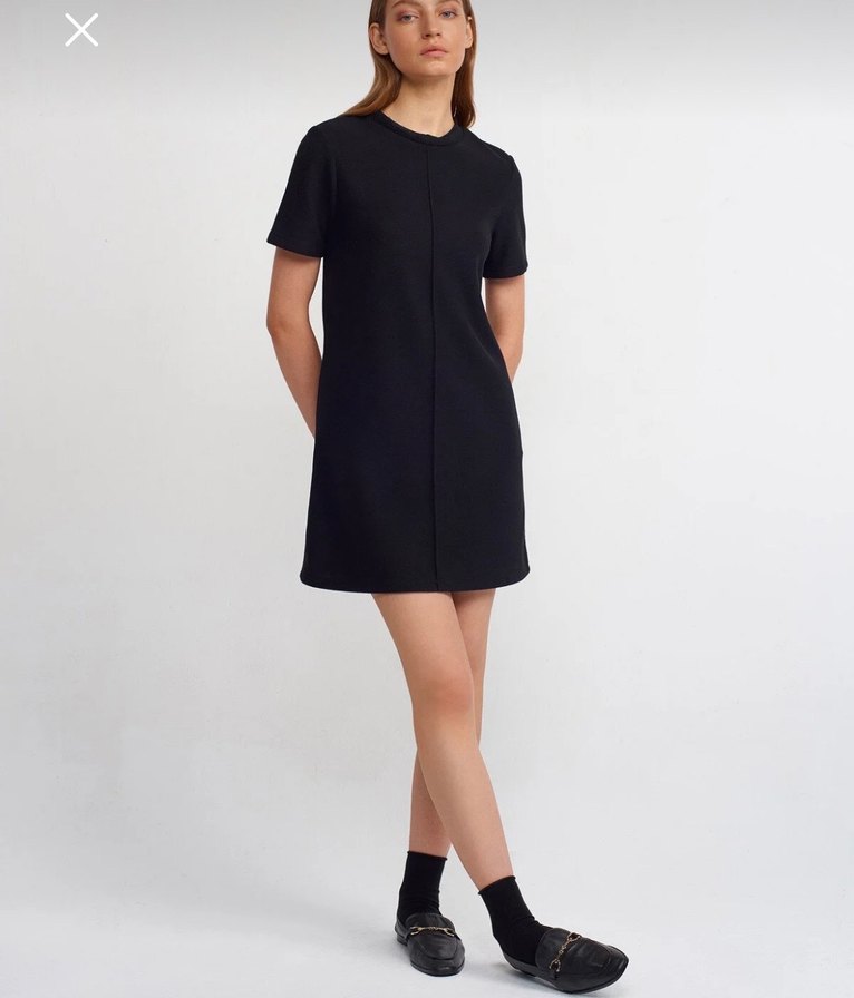 Siyah midi elbise, kısa kollu ve yuvarlak yaka tasarıma sahiptir. Düz ve rahat kesimiyle ofis için uygundur. ✨ bir defa giyildi triko elbise