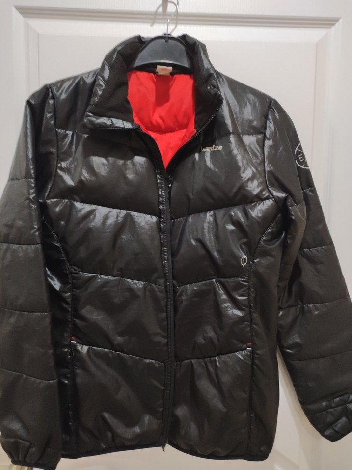 Yurt disindan alindi mevsimliktir ince S beden. Göğüs 50 boy 66 cm.dir. Siyah, sentetik kumaştan yapılmış, fermuarlı, midi uzunlukta, dar kesim kadın kışlık mont. Notched yaka ve uzun kolludur, kırmızı iç astarı vardır.