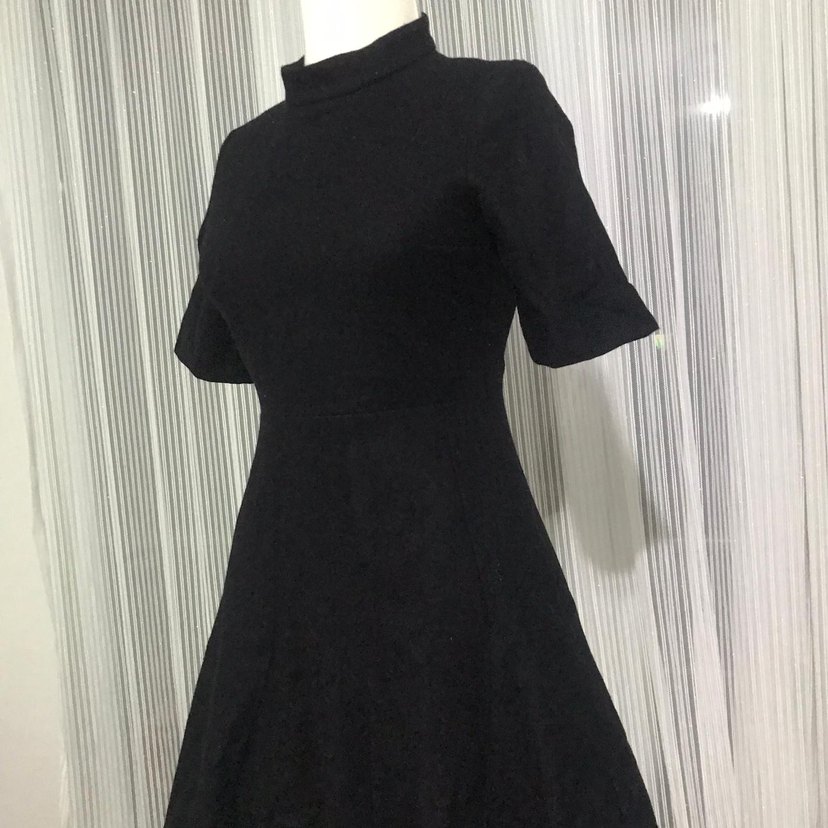 Siyah midi elbise, yüksek yakalı ve kısa kollu, pileli detaylara sahip. Düzenli kesim ve klasik goth tarzında, ofis için uygun.
