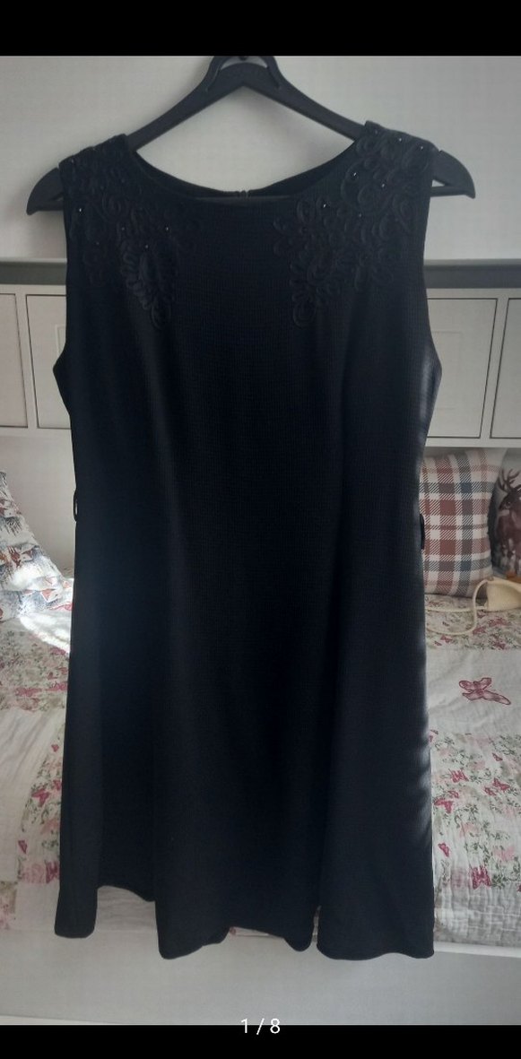 Siyah kolsuz midi elbise, V yakalı ve drapeli detaylıdır. Düzenli kesimle ofis kullanımı için uygundur, klasik stile sahiptir. 38 bedendir. Diz hizasında bir boyu vardır. siyah çiçek motiflidir. Kemerli ve kemersiz kullanıma uygundur. Tek sorunu etiketinin sökülmüş olmasıdır, başka bir sorunu bulunmamaktadır.
