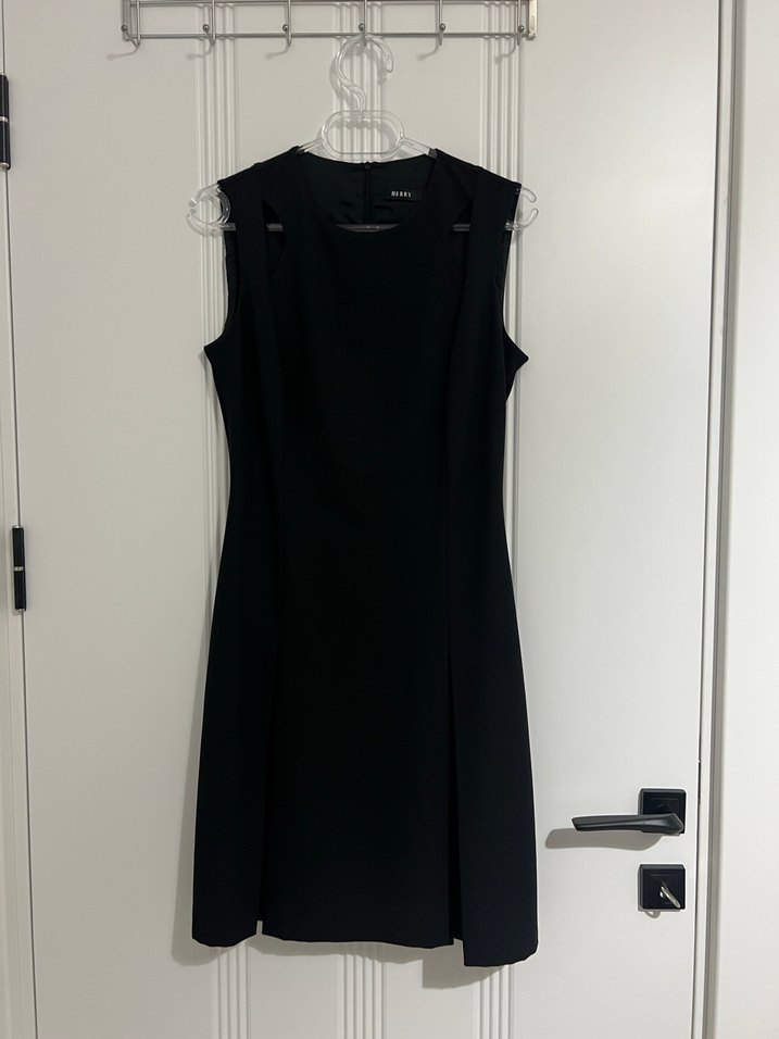 Kolsuz siyah midi elbise, göğüs kısmında yırtmaç detaylı, oturan kesim ve minimalist gotik tarzda. Ofis kullanımı için uygundur. Dizin hemen üstünde bitimi var Pazarlık vardır