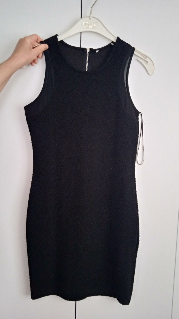 Siyah midi boy, kolsuz, dar kesim elbise. Yuvarlak yaka ve sırtında fermuar detayı bulunur. Minimalist ve gotik tarzda, günlük kullanıma uygun.