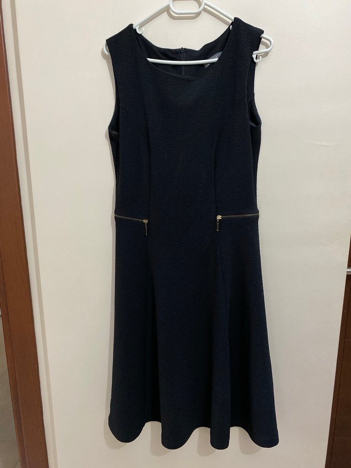 Kısa değil diz de bir elbise. Siyah midi uzunlukta, kolsuz ve yuvarlak yakalı elbise, bel kısmında fermuar detaylarıyla klasik ve şık ofis tarzı sunar.