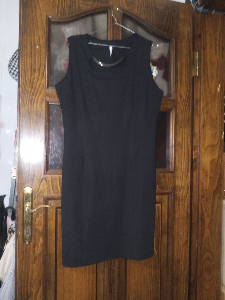 Kolsuz, yuvarlak yakalı siyah midi elbise, rahat kesim ve sentetik kumaştan. Minimalist ve ofis şıklığı için uygun.