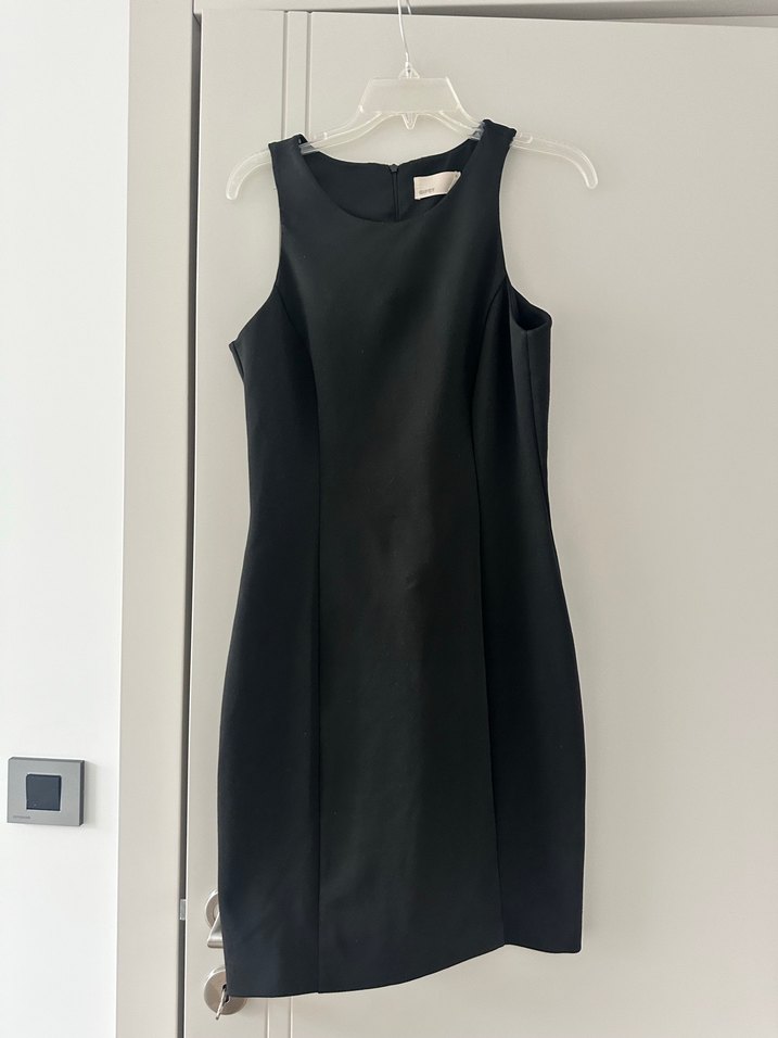 Kolsuz, yüksek yakalı ve vücuda oturan siyah midi elbise, minimalist ve klasik bir görünüm sunar. Desensiz ve şık, ofis için uygundur. Esnek kumaş gizli fermuarlı üste oturan rahat ofis jile