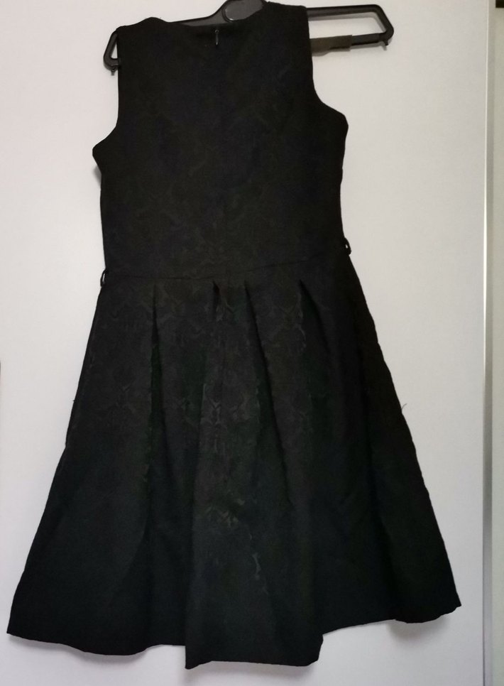 Kolsuz, V yaka ve pilili detaylara sahip siyah midi elbise, gotik tarzda ofis için uygun bir seçenek.