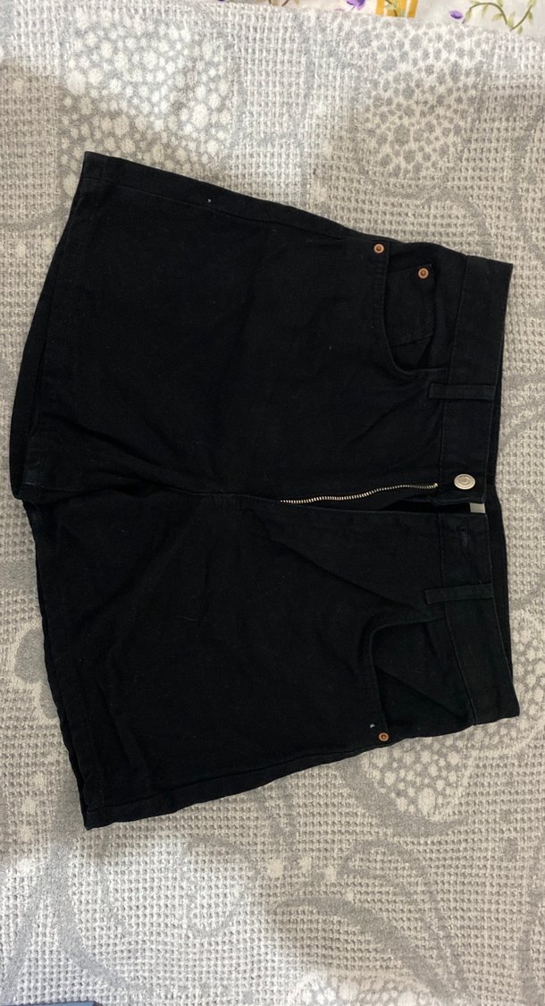 Siyah midi uzunlukta, rahat kesim ve fermuarlı detaylı kot şort. Günlük kullanım için uygun, grunge punk tarzına uygun sokak giyimi.