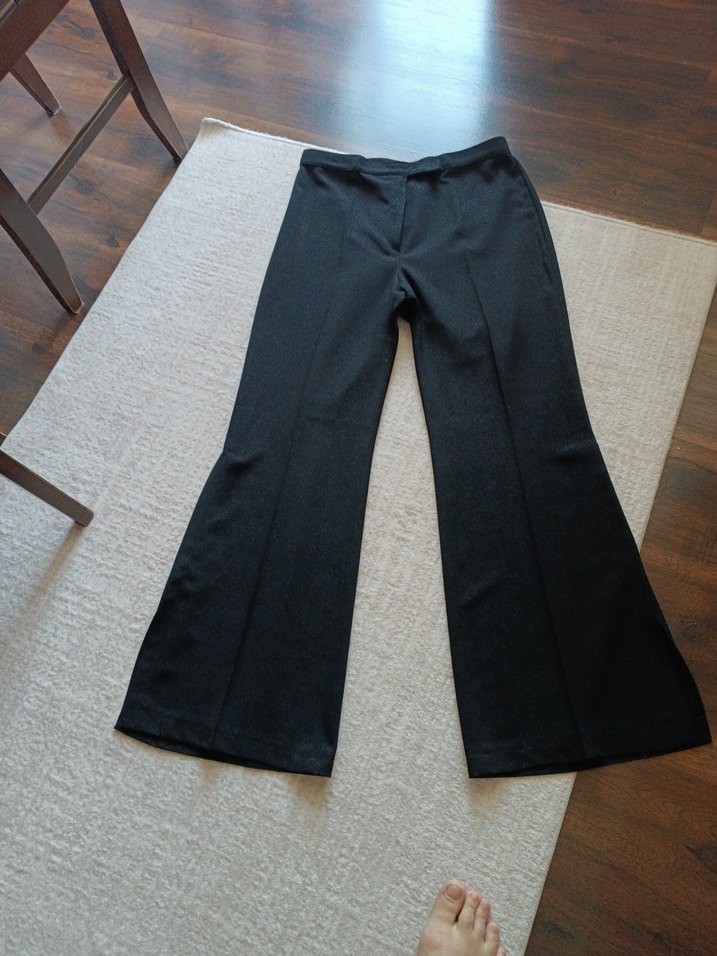 Siyah midi boy kumaş kadın pantolon, normal kesim ve yırtmaç detaylı, ofis için uygun. Pürüzsüz sentetik kumaştan üretilmiştir.
