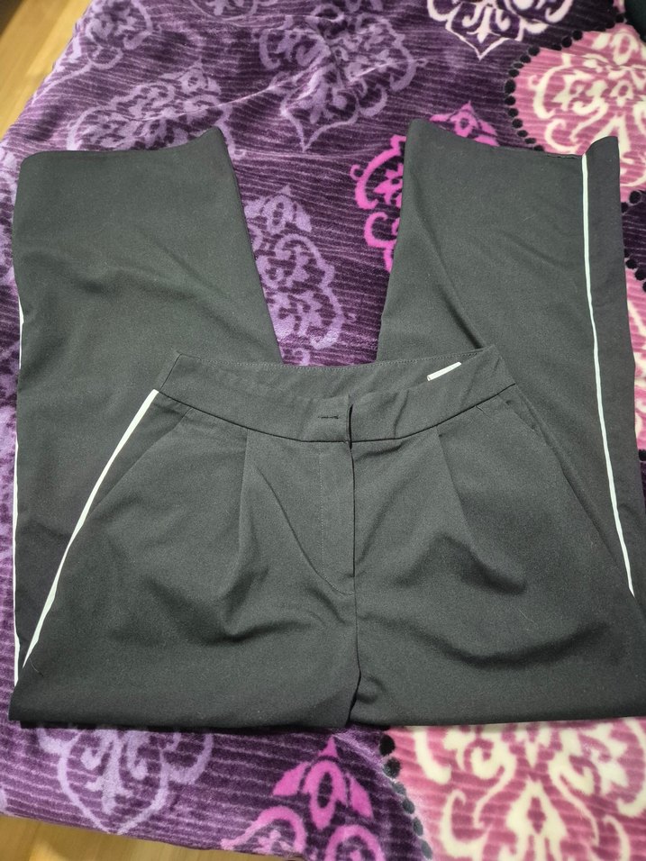 Düz siyah midi uzunlukta, sentetik kumaştan yapılmış, fermuarlı cepleri olan, ofis ve sokak stili için uygun regular fit pantolon.