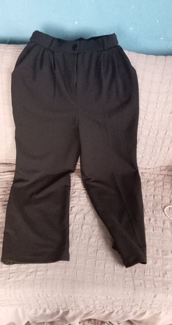 Siyah midi boy, regular fit kadın pantolon, yumuşak sentetik kumaştan, ofis ve iş ortamları için uygun, trend casual tarzda.