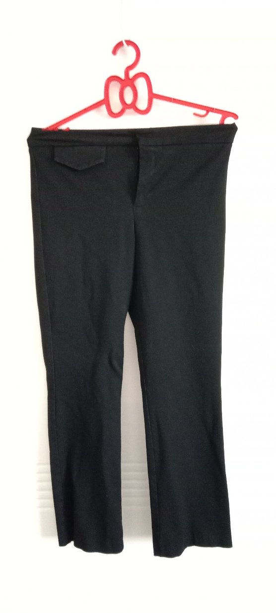 Siyah midi uzunlukta, regular fit kumaş pantolon. Düz, şık ve ofis için uygun, yumuşak sentetik kumaştan yapılmıştır.