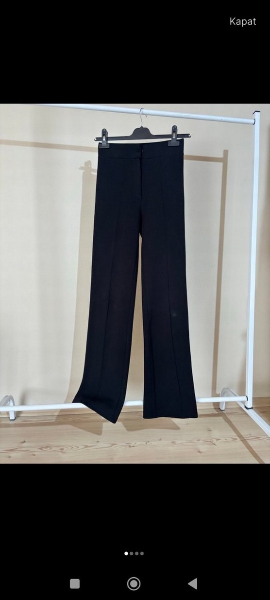 Siyah midi uzunlukta, regular fit kumaş kadın pantolon. Ofis kullanımı için uygun, yırtmaç detaylı, yumuşak sentetik kumaştan üretilmiştir. adet fiyatı 50 tl