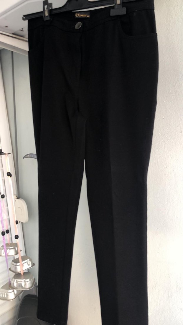 Siyah, midi boy, kumaş kadın pantolon. Normal kesim ve kemerli, ofis ve günlük kullanıma uygun. 44 beden yazıyo ama 42 beden tam oluyo Likralı / yüksek bel/ kumaş pantalon