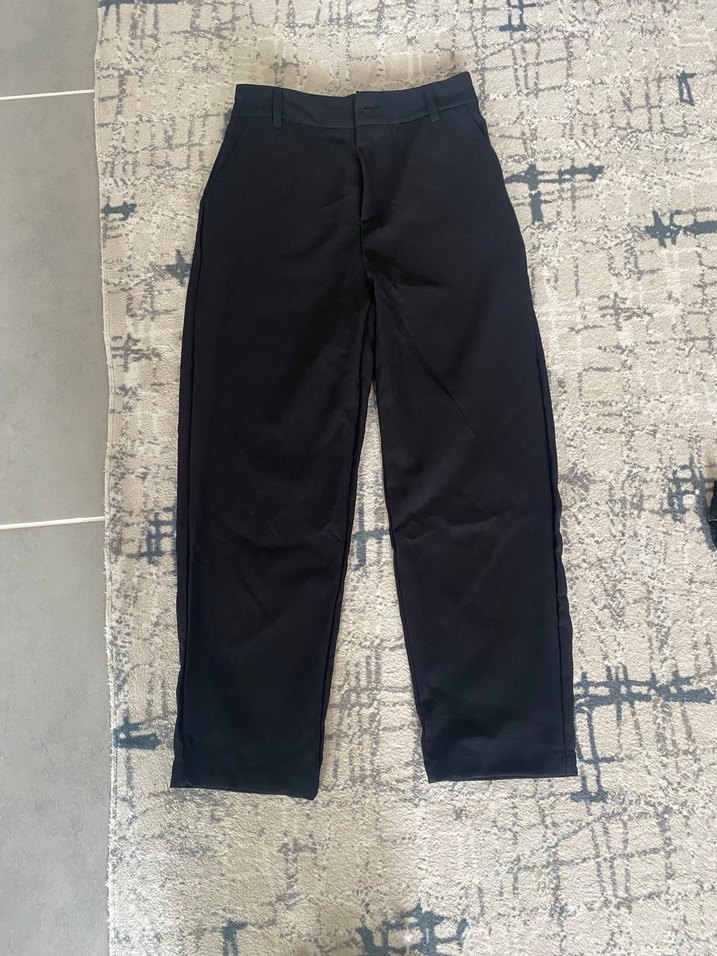 Düz siyah midi uzunlukta, regular fit kumaş pantolon. Suni kumaştan üretilmiş, minimalist ve desen içermeyen tasarım ofis ve günlük kullanıma uygundur.