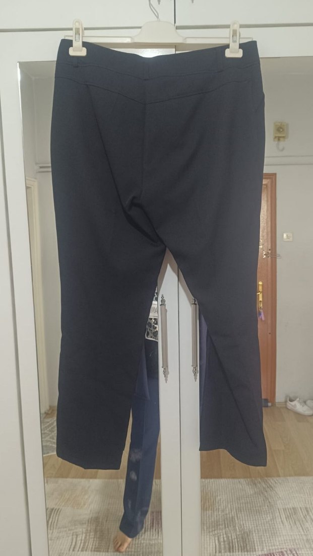 Siyah, midi boy, regular fit ve yırtmaç detaylı kadın pantolonu, yumuşak sentetik kumaştan, ofis kullanımı için uygun.