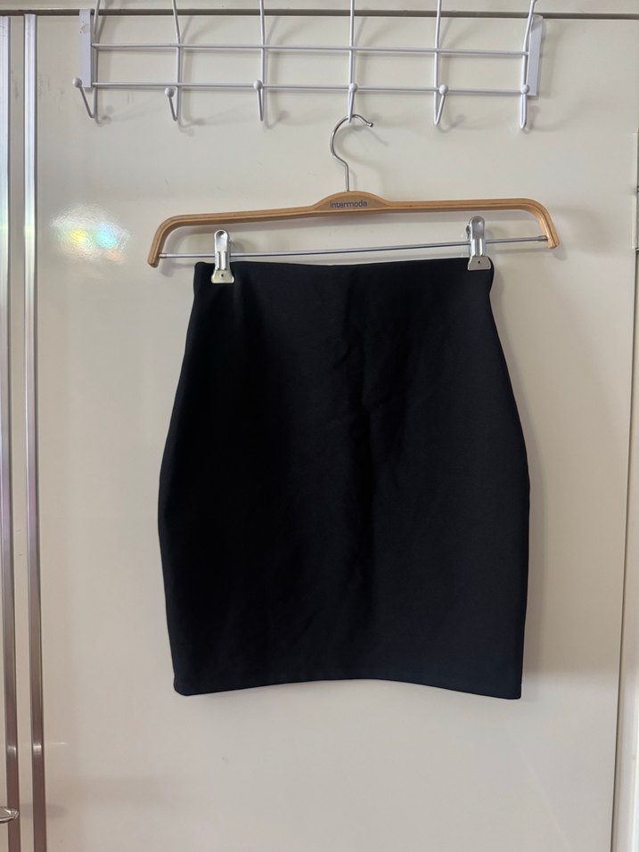 Düz siyah, midi uzunlukta, vücuda oturan mini etek. Pürüzsüz sentetik kumaştan, desen içermeyen sade tasarım, ofis kullanımı için uygun.