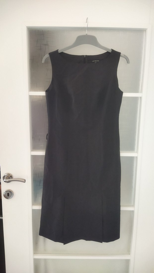 Kolsuz, siyah midi elbise, regular kesim ve V yaka ile. Ofis ve iş ortamları için klasik şıklık sunar.