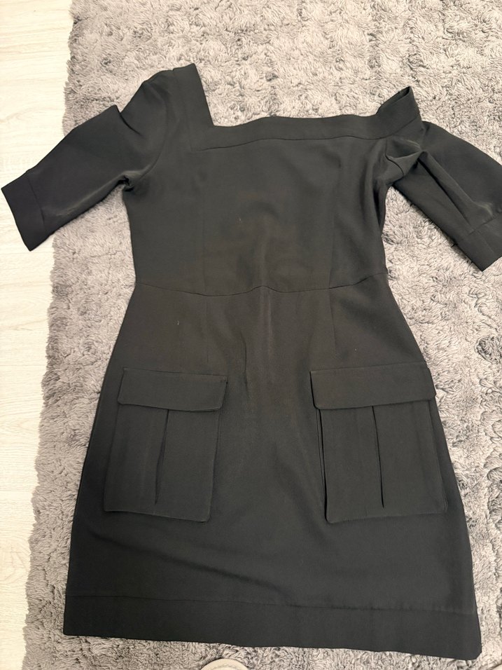 Siyah renkli, asimetrik yakalı kısa kollu, midi uzunlukta ofis elbisesi. Önde cepleri vardır, vücuda oturan kesime sahiptir.