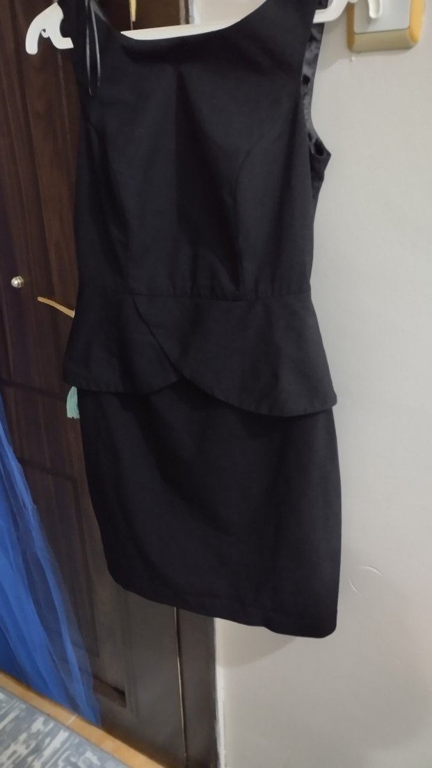 Kemer detaylı, siyah, diz boyu, kolsuz ve yakası kesimli bu elbise, modern ve iş ortamına uygun şık bir tasarıma sahiptir.