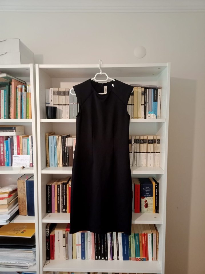 Siyah renkte, kolsuz ve V yakalı midi uzunlukta bu elbise, ofis için şık bir tercih.Vücuda oturan kesime sahiptir. Birkac kez giyildi, kusuru yoktur. Ankara içi elden teslim edilebilir.