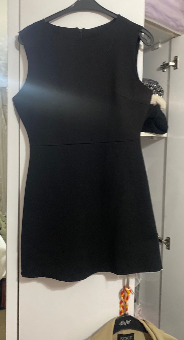 , kolsuz, siyah midi elbise, Parisli gotik tarzıyla ofis kullanımı için uygun. Altında beyaz fırfırları vardı onları kestim biraz ip detay var