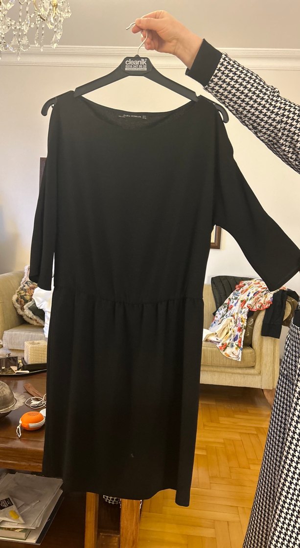 Siyah midi uzunlukta, uzun kollu, salaş kesim örme elbise. Drapeli ve düz tasarımıyla minimalist bir görünüme sahiptir. Günlük kullanıma uygundur.