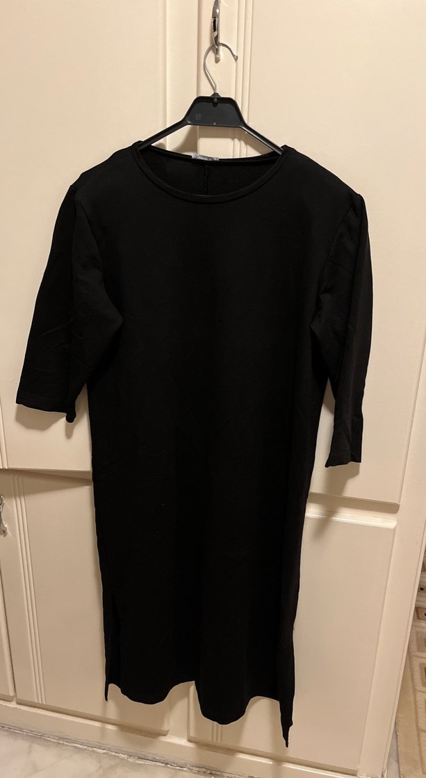 Siyah midi uzunlukta, kısa kollu, yuvarlak yakalı, sade tasarımlı, günlük kullanıma uygun, vücuda oturan kadın triko elbise. Vatkaları, yırtmaç detayı mevcuttur