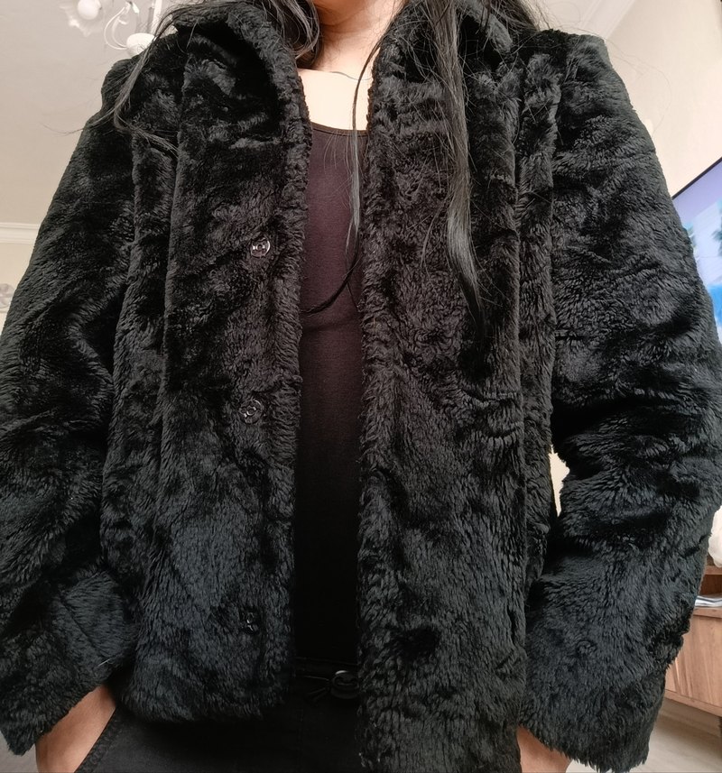Siyah midi uzunlukta peluş kürk detaylı ceket hiç kullanilmadi.