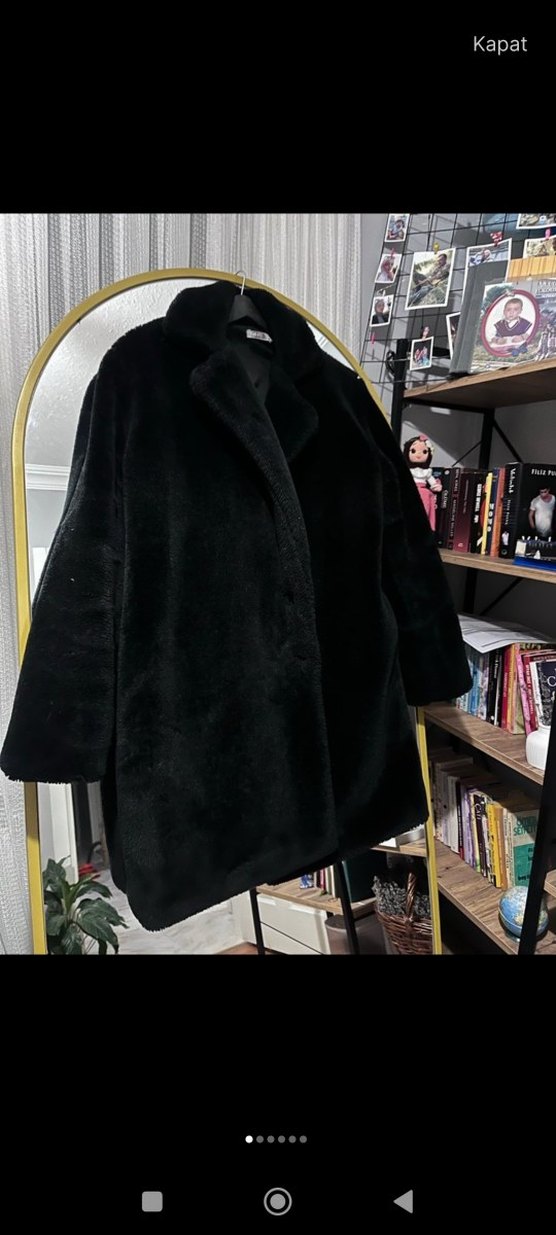 Siyah midi boy, uzun kollu, yakalı ve kürk detaylı, rahat kesim kadın kaban.peluş DeFacto 80 85 uzun 40 44 bedene kadar uygun