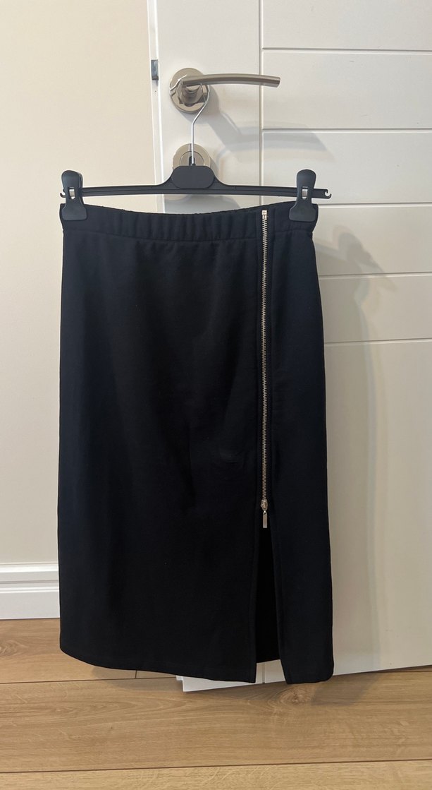 Fermuarlı, kalın penye siyah midi kadın eteği, minimalist gotik tarzı için uygun, ofis kullanımı için ideal.