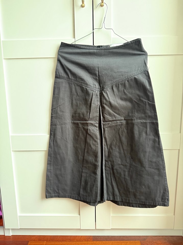 Siyah renkte, yumuşak pamuk kumaştan yapılmış, pilili ve bol kesim midi etek. Minimalist ve normcore tarzına uygun, günlük kullanıma ideal.