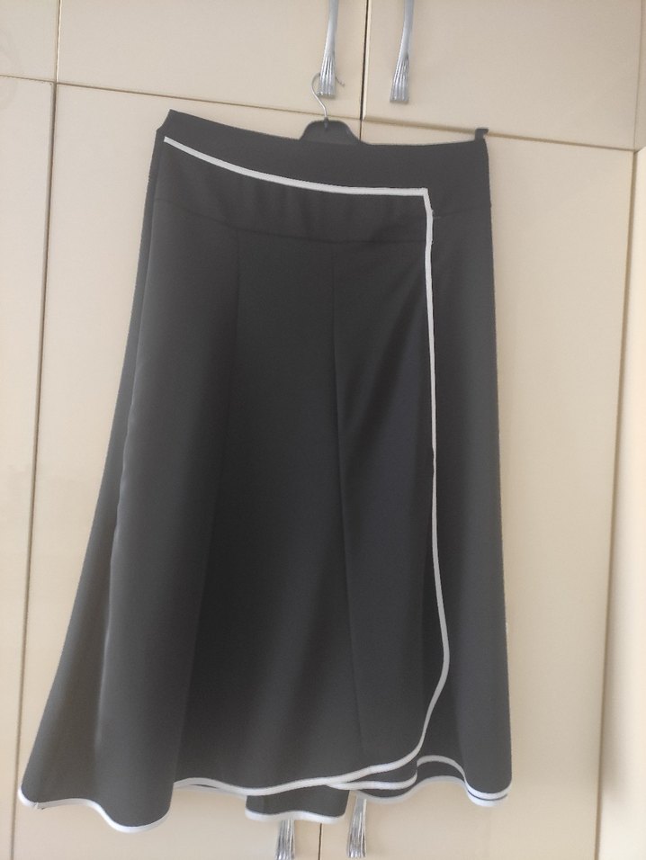 Siyah midi boy, pilili ve beyaz şerit detaylı kadın eteği. Düzgün kesimli, sentetik kumaştan, ofis için uygun.