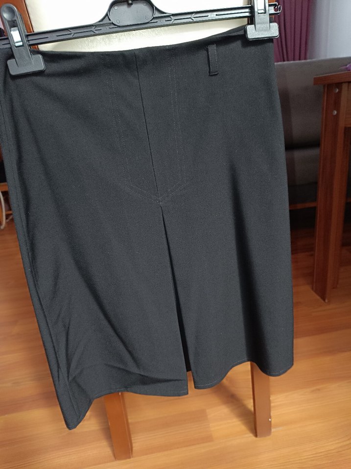 Gri renkte, sentetik kumaştan, piliseli ve normal boyda eteği. Ofis kullanımı için uygundur.