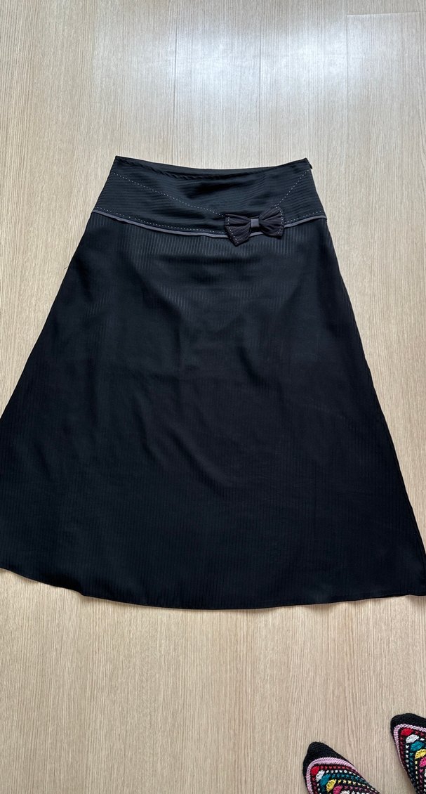 Siyah midi etek, bol kesim ve beli küçük fiyonk detaylı piliseleriyle, düz ve yumuşak sentetik kumaştan üretilmiştir. Ofis kullanımı için uygundur.