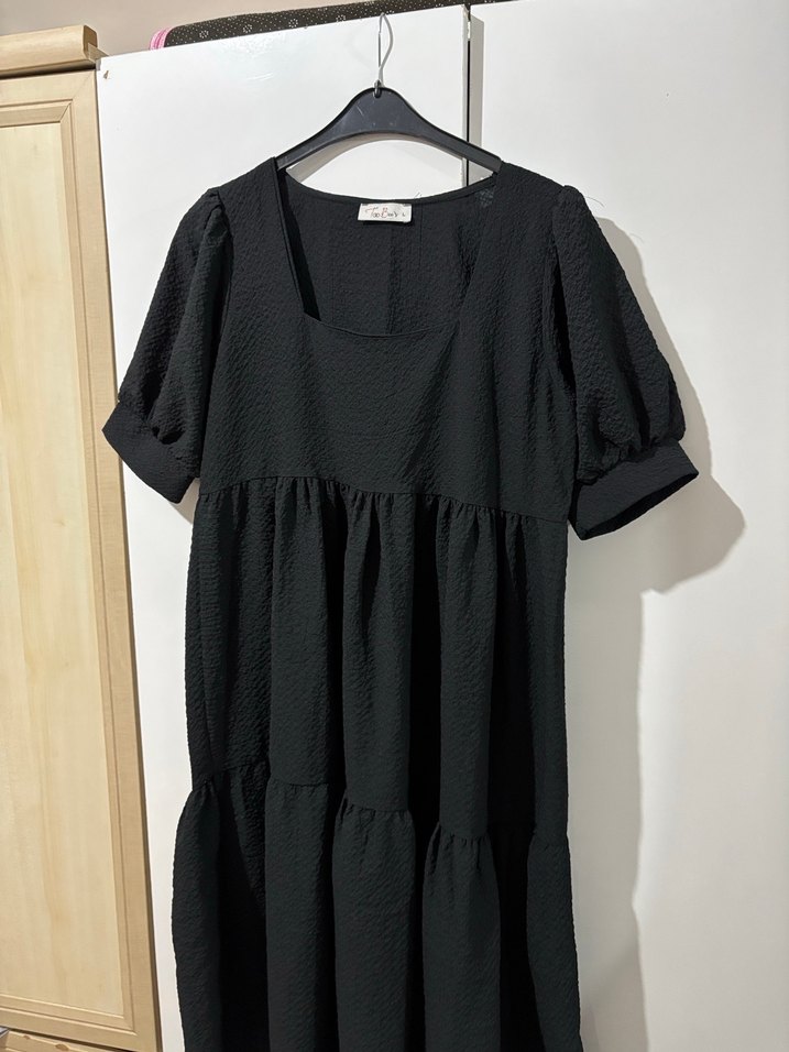 Siyah midi elbise, kısa kollu ve salaş kesimdir. Fırfır detayları ve rahat sentetik kumaşı vardır. Yuvarlak yaka ve minimalist sokak stili sunar.