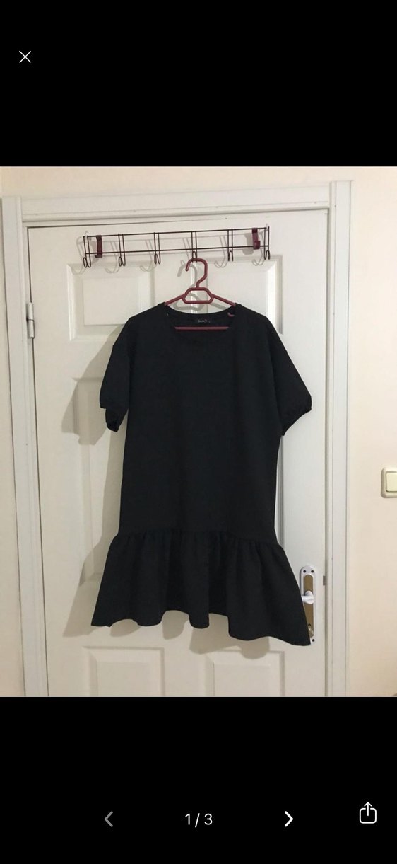 Siyah midi elbise, kısa kollu ve bisiklet yaka ile rahat bir görünüm sunar. Etek kısmında fırfır detayı vardır, salaş kesimdir ve sentetik kumaştan üretilmiştir.