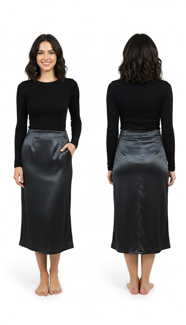 Siyah, saten dokulu, midi boy, vücuda oturan kadın etek. Normcore tarzıyla günlük kullanıma uygun, zahmetsiz şıklık sunar.