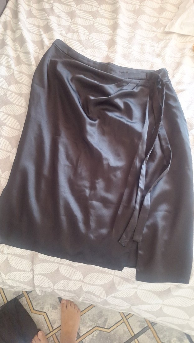 Siyah midi uzunlukta, parlak ve saten dokulu, salaş kesim ve drapeli tasarıma sahip etek. Desensiz ve gotik Paris tarzına uygun, ofise uygun şık parça.