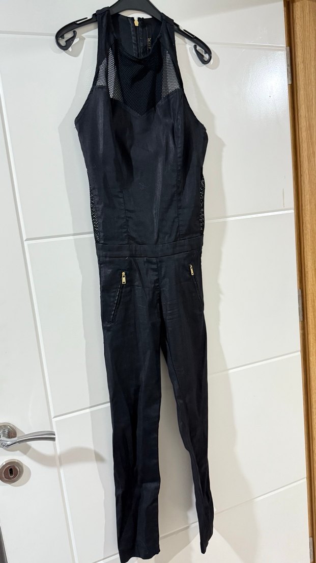 Siyah midi boy, yüksek yakalı, askılı kol tasarımlı, sentetik kumaştan yapılmış sıkı kesim tulum. Fermuarlı cepleri ve günlük kullanıma uygun sokak stili bulunur. File detayları ile çok seksi görünüyor mumlu kumaş tertemiz bir ürün s ve m bedene uyar