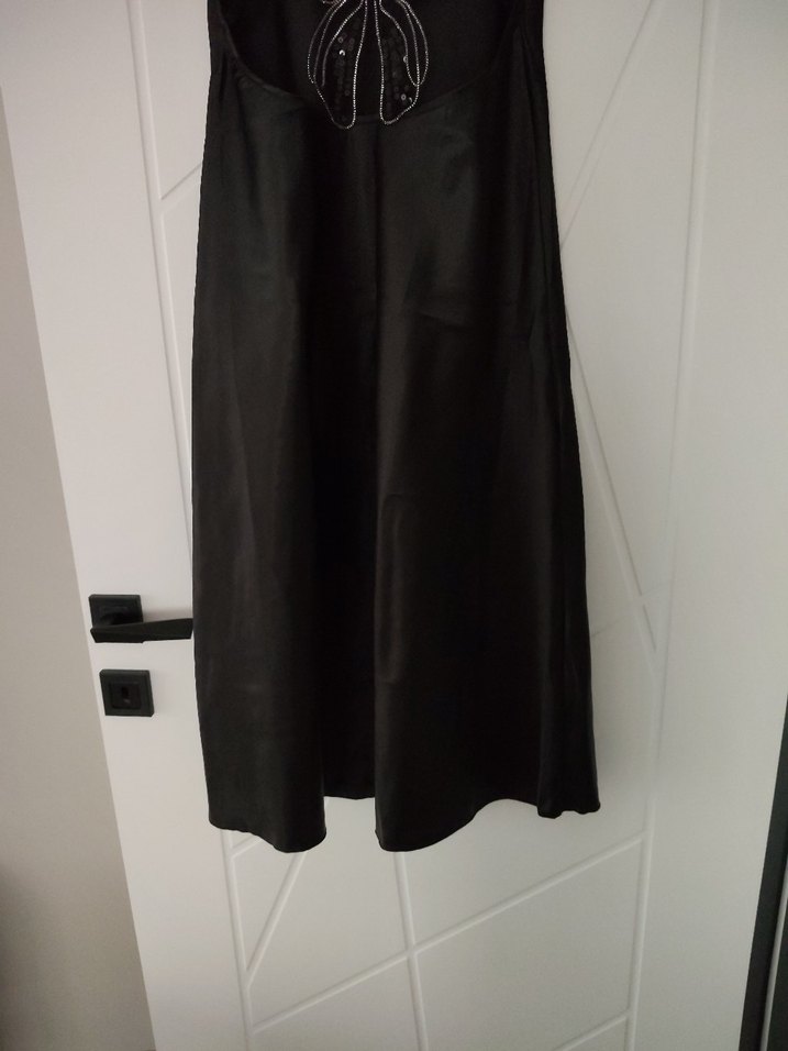 Siyah midi uzunlukta, kolsuz, V yakalı ve dökümlü kesime sahip ipeksi kumaştan kadın elbisesi. Minimalist gotik tarzda, romantik akşamlar için uygun.