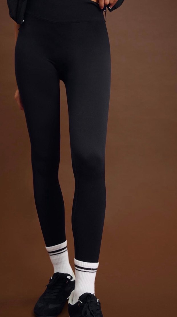 Düz siyah, midi boy, vücuda oturan kadın tayt. Pürüzsüz sentetik kumaştan, spor ve şık tarzlar için uygun.