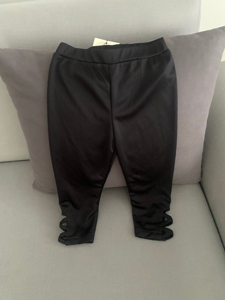 Siyah, esnek sentetik kumaştan yapılmış, spor ve günlük sokak stili için uygun, beli lastikli cocuk midi tayt. Desensiz ve sade tasarım.