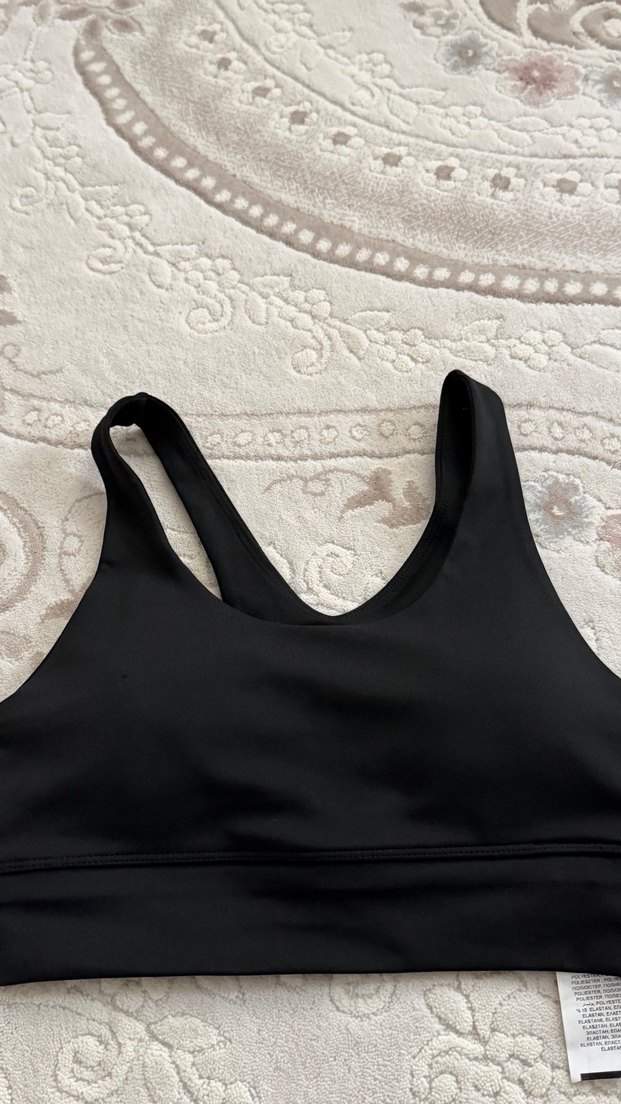 Siyah renkte, desensiz ve midi boyda spor sütyeni. Streetwear tarzında ve normal uzunlukta, rahat athleisure kullanımı için uygundur.