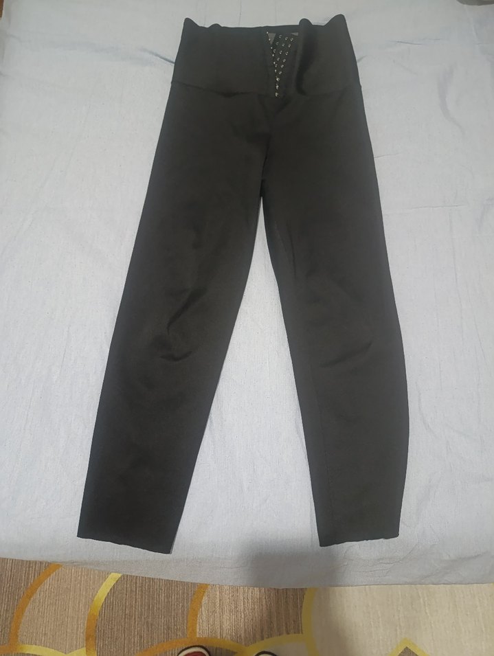Düz siyah, midi boy, regular fit spor tayt. Pürüzsüz sentetik kumaştan, günlük kullanım için uygun. ARKASINDA BİRAZ SÖKÜK VARDIR DİKİLİR
