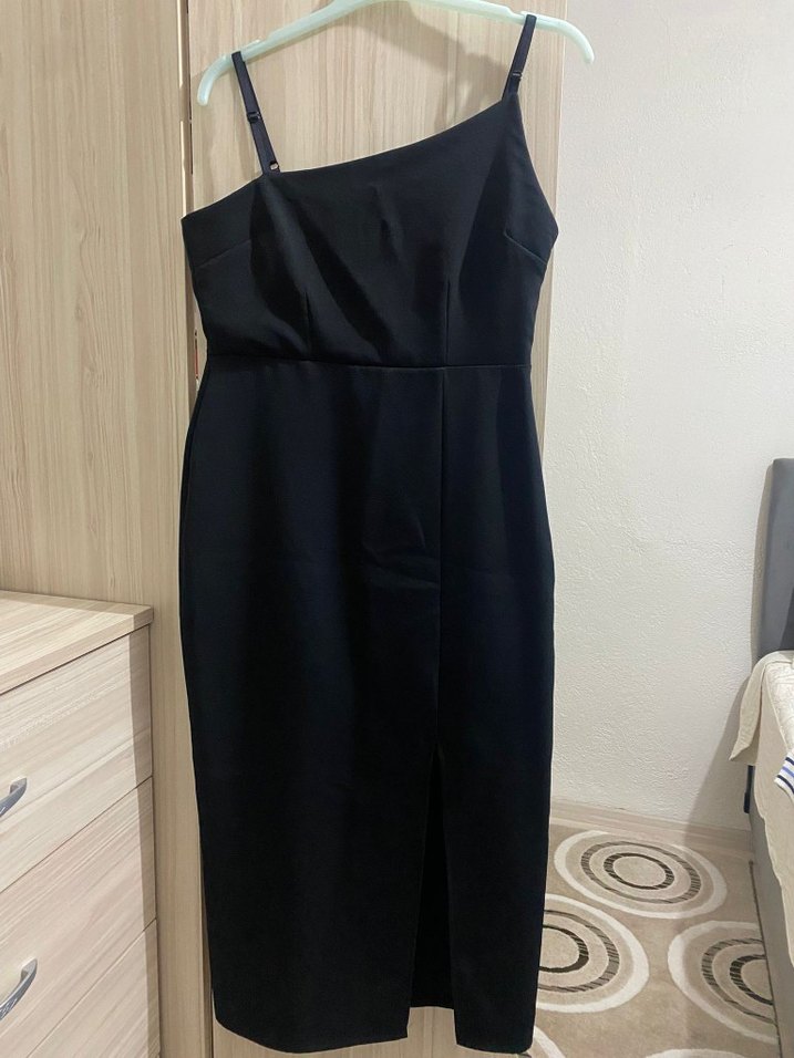 Siyah midi uzunluğunda, straplez ve askılı, vücuda oturan, drapeli tasarıma sahip kadın elbisesi. Minimalist ve gotik tarzda, romantik akşamlar için uygun.